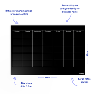 Our Monthly Planning Support Bundle includes a reusable black acrylic wall planner, a 5-pack of vibrant writing tools, and a sheet of static stickers tailored for common daily activities and appointments. This combination provides a functional tool to help structure the month and visually display important tasks and goals.